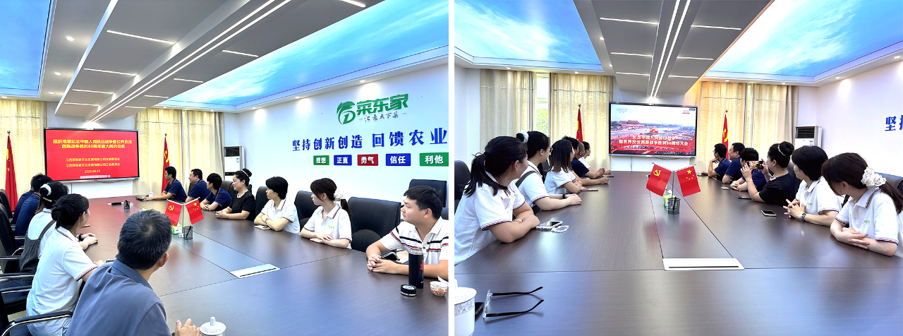 9月3日上午,江西菜東家農(nóng)業(yè)發(fā)展有限公司支部委員會、工會委員會組織員工集中觀看了紀(jì)念中國人民抗日戰(zhàn)爭暨世界反法西斯戰(zhàn)爭勝利80周年閱兵式。本次閱兵儀式不僅是一場視覺盛宴,更是一次震撼心靈的精神洗禮,還是一次深刻的愛國主義教育。